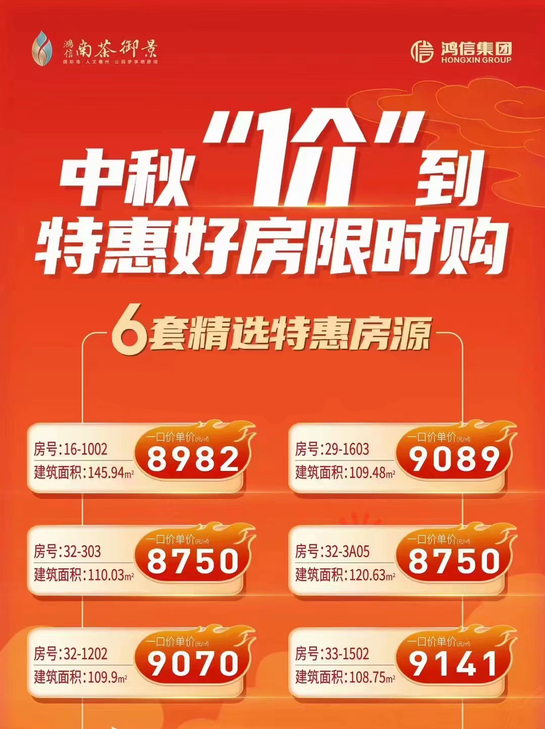 儋州 鸿信南茶御景(户型 动态 相册)中秋“价”到,6套特惠好房限时购,活动户型建筑面积108.75-145.94㎡,其中32-303房建筑面积110.03㎡,特惠单价8750元/㎡,具体优惠详情见下图,一房一价,活动时间:2023年9月28日至2023年10月6日,具体时间以房源出售情况为准,售完即止。