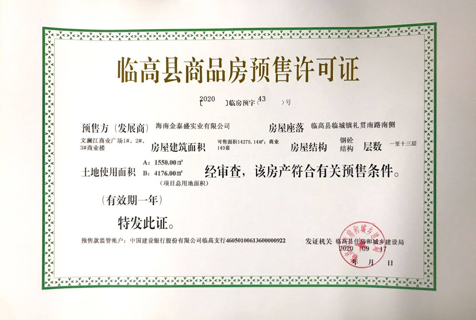 预售证号: 【2020】临房预字43号