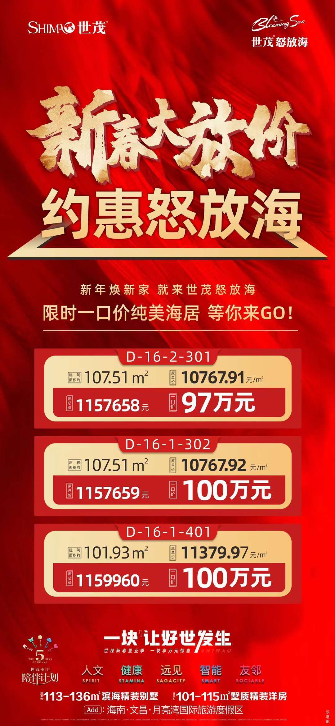 文昌 世茂怒放海( 户型 动态 相册 )新春大放价,项目推出3套特价房源,在售的户型建筑面积为101㎡-107㎡纯海居,原总价115万/套,现特价总价97万/套。(活动时间:即日起至-2022年2月28日)