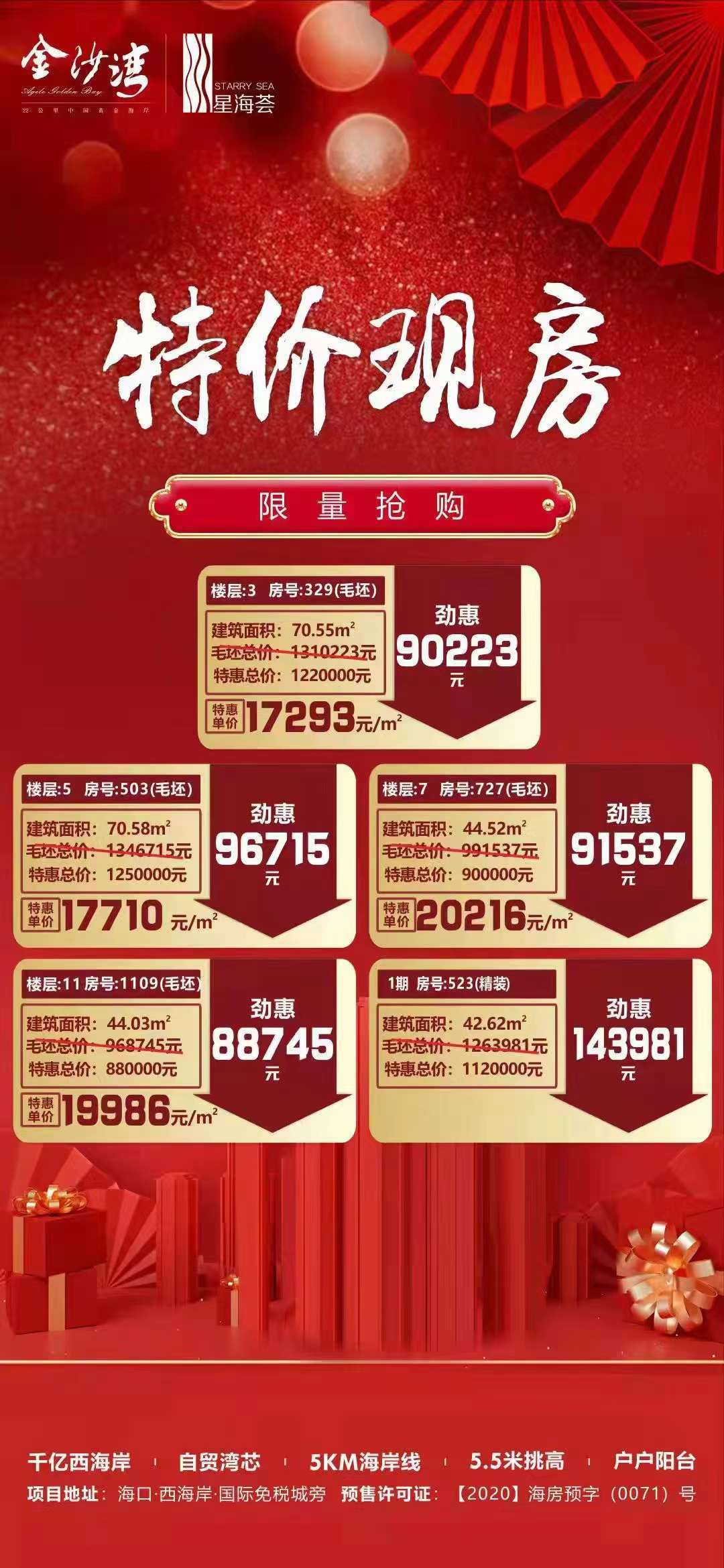 海口 雅居乐金沙湾SHOH ( 户型 动态 相册 )特价现房,限时抢购,项目加推5套特价现房,在售的户型建筑面积为42㎡-70㎡户型,特价单价17000元/㎡。(活动时间:即日起至-2022年2月28日)