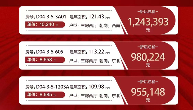 澄迈 富力红树湾( 户型 动态 相册 )项目特惠一夏,助力安家,推出3套房源,建筑面积为109㎡-121㎡。其中D04-3-5-605房,建筑面积为113.22㎡,三房两厅,东北朝向,现单价8658元/㎡,总价98万元。其他房源信息如下图,一房一价。(活动时间:即日起至2022年7月31日)