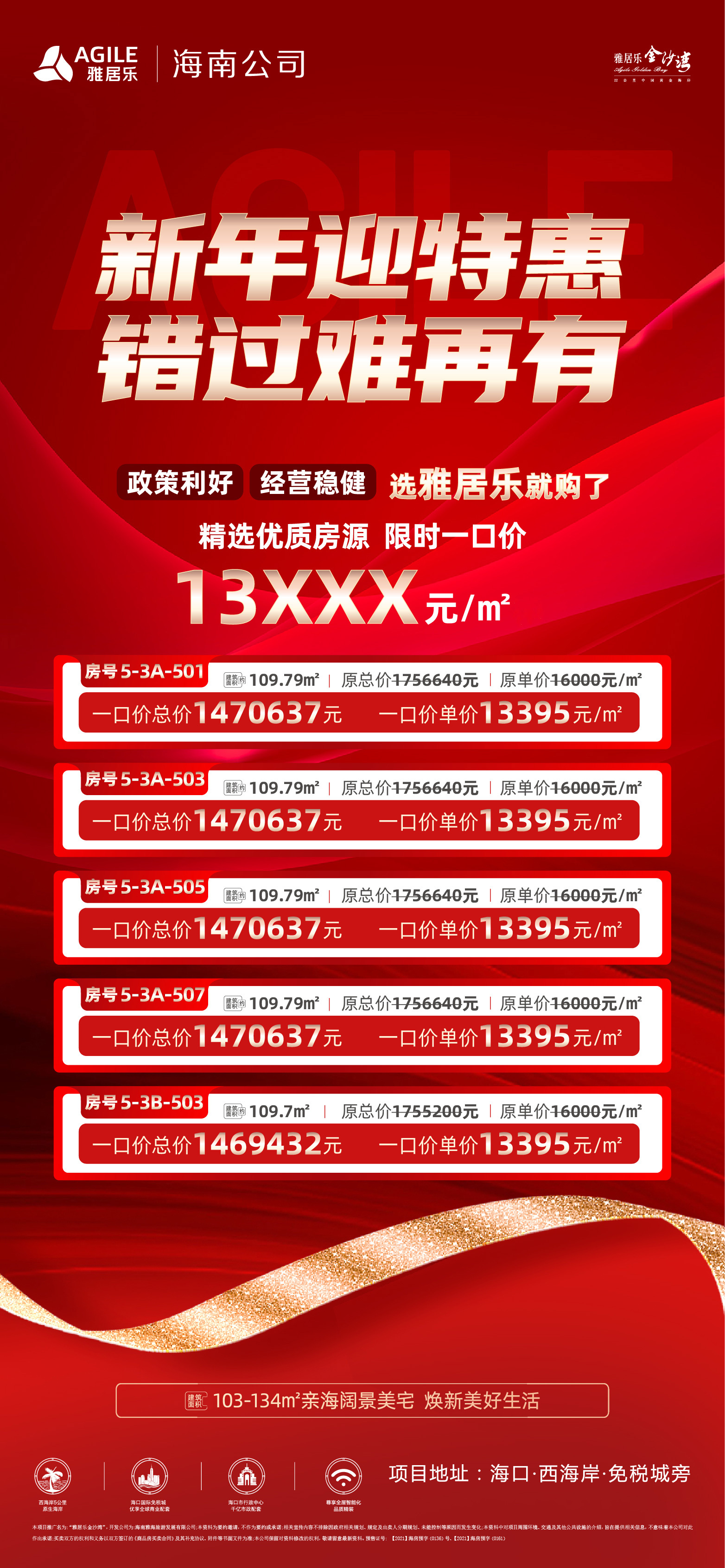 海口 雅居乐金沙湾( 户型 动态 相册 )新年迎特惠,项目精选5套特价房,活动户型建筑面积109.7-109.79㎡,原均价16000元/㎡,一口价单价13395元/㎡,其中5-3B-503房,建筑面积109.7㎡,原总价175.5万元/套,特惠一口价总价146.9万元/套。其他房源具体优惠详情见下图,一房一价,活动截止时间为2023年1月20日。