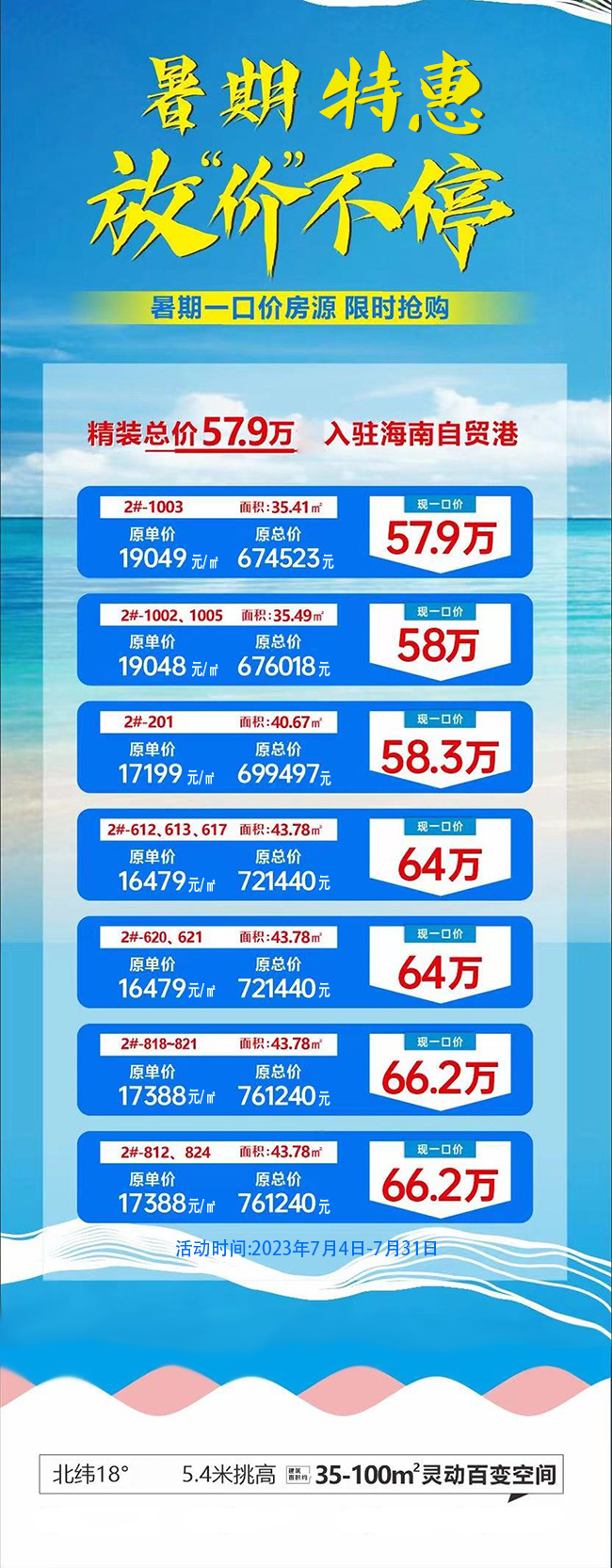 万宁 千弘国际( 户型 动态 相册 )项目暑期特惠,推出一口价房源,均为现房、现证,5.4米挑高的LOFT房源,主力户型建筑面积为35㎡-44㎡。其中房号为2#-1003房,户型建筑面积为35.41㎡,原价19049元/㎡,原总价674523元,特惠总价57.9万。其他房源具体优惠详情见下图,一房一价,活动时间:2023年7月4日至2023年7月31日,具体时间以房源出售情况为准,售完即止。