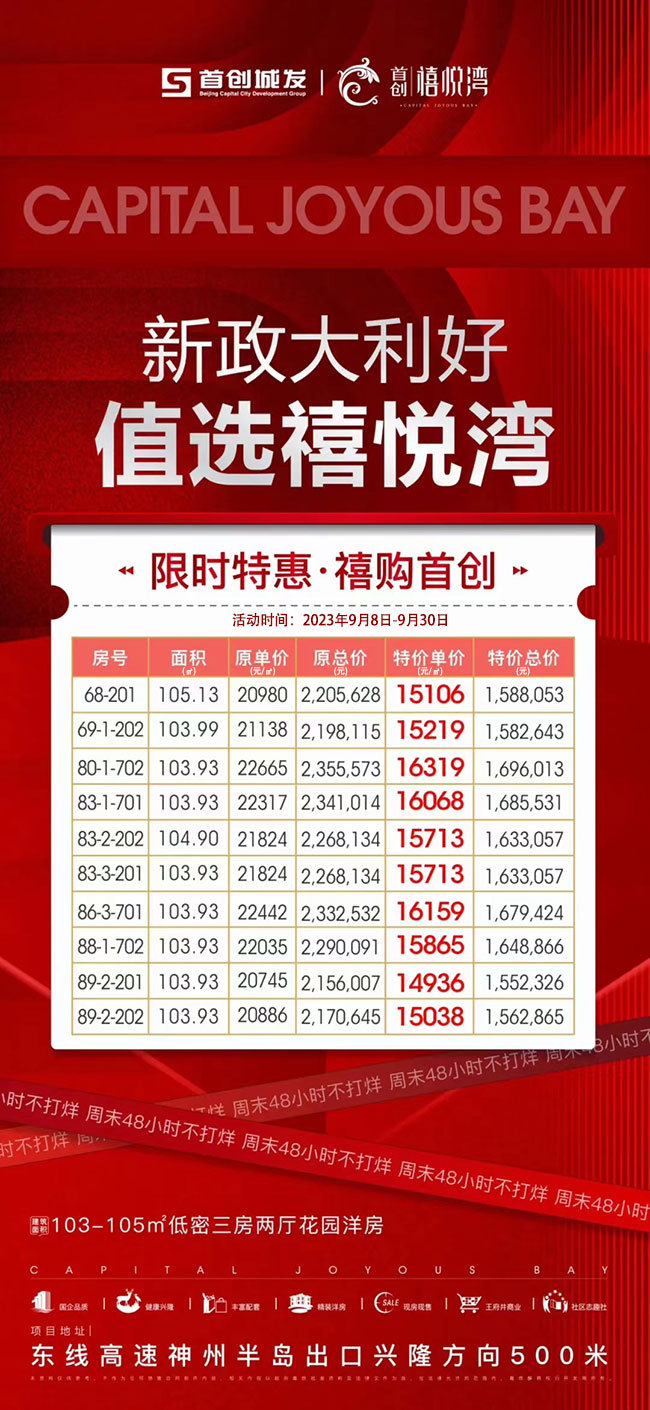 万宁 首创禧悦湾(户型 动态 相册)项目九月特惠,共推出10套特惠房源,户型建筑面积103㎡-105㎡,三房两厅两卫。其中89-2-201房,原单价20745元/㎡,原总价2156007元,特惠单价14936元/㎡,特惠总价1552325元。其他房源具体优惠详情见下图,一房一价,活动时间:2023年9月8日至2023年9月30日,具体时间以房源出售情况为准,售完即止。