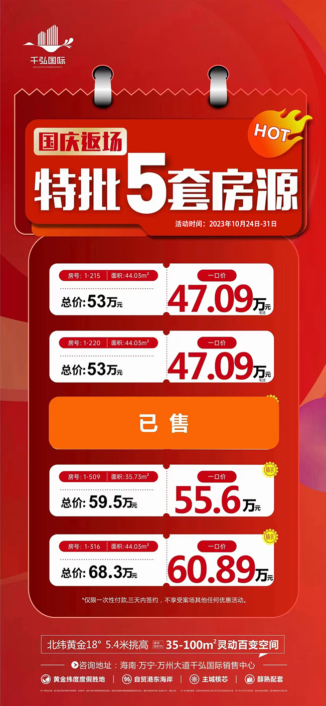 万宁 千弘国际( 户型 动态 相册 )特惠返场,共推出5套特惠房源,目前已售出一套,还有四套,活动户型建筑面积35㎡-44㎡,其中1-220房和1-215房建筑面积44.03㎡,原总价53万元/套,一口价总价47.09万元/套。其他特惠房源具体优惠详情见下图,一房一价,特价房活动时间:2023年10月24日至2023年10月31日,具体时间以房源出售情况为准,售完即止。