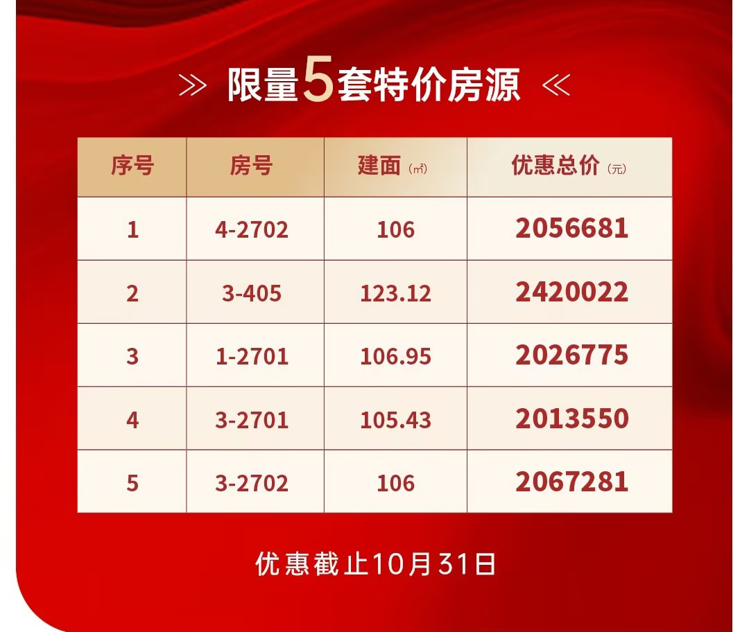 10月好房特惠, 海口 招商雍江湾 (户型 动态 相册)项目推出5套特价房,活动户型建筑面积105.43-123.12㎡,其中3-2701房建筑面积105.43㎡,优惠总价2013550元/套,具体优惠详情见下图,一房一价,活动时间:2023年10月24日至2023年10月31日,具体时间以房源出售情况为准,售完即止。