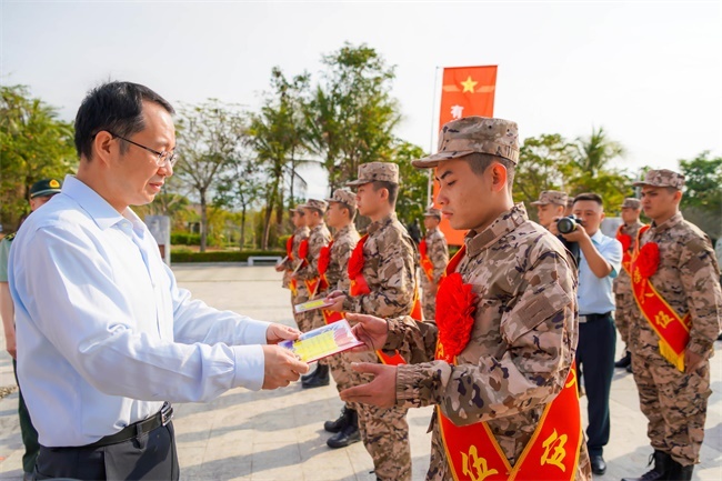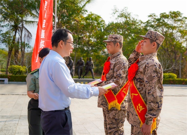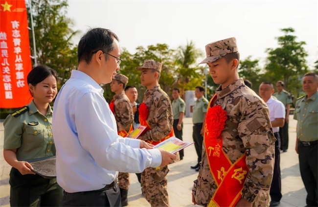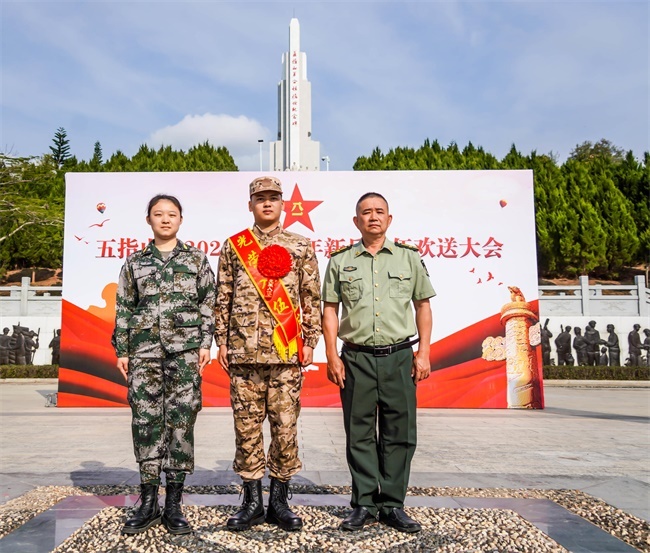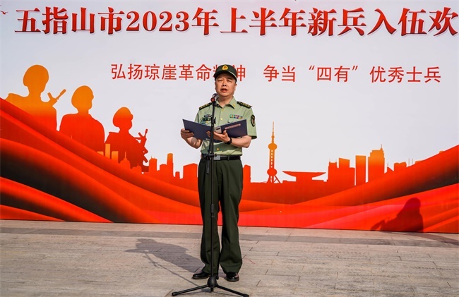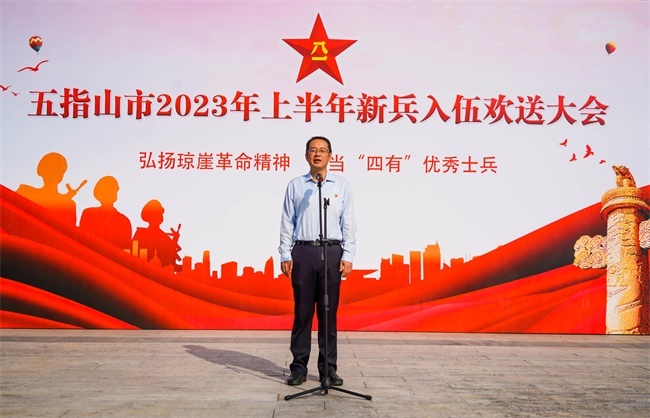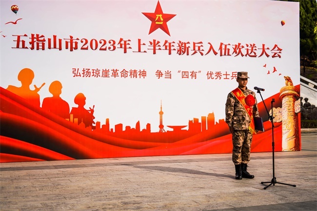 在雄壮的中 国人民解放军军歌声中,欢送大会拉开帷幕,新兵们身着军装,肩披绶带,胸前佩戴着大红花,个个精神抖擞。朱宏凌一一为他们颁发入伍通知书,并勉励大家要继续发扬琼崖革命传统,赓续红色血脉,以“首战用我、用我必胜”的信心和决心,练就过硬本领,奋力拼搏、建功立业;要讲政治、讲大局、守纪律,在部队这个大熔炉里,展现“1867工作作风”,为五指山高质量跨越式发展增光添彩。