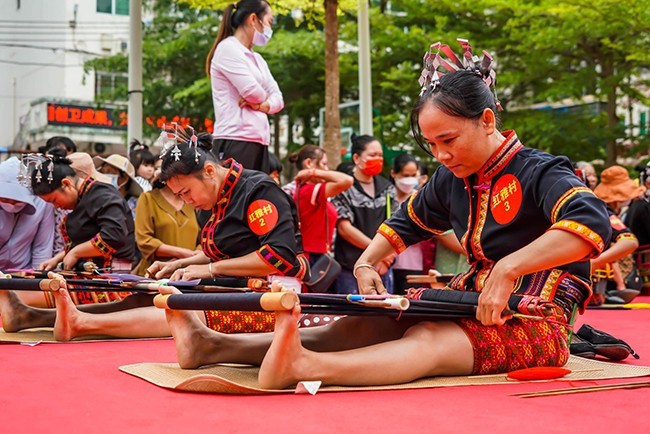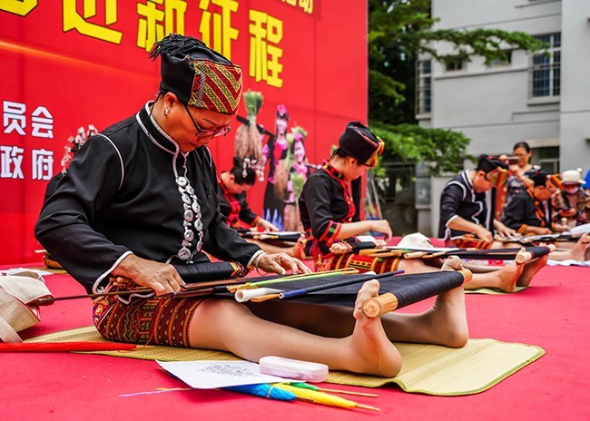 黎族织锦技艺比赛现场,30名织娘身着民族服饰并排而坐,手持五彩丝线、手脚并用进行编织。一根根色彩鲜艳的棉线、丝线,一会儿推一会儿拉,一幅幅绘有民族特色的黎锦图案逐渐呈现,让前来观看的市民游客赞不绝口。