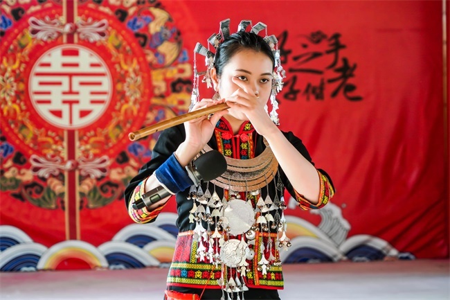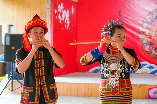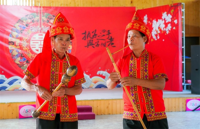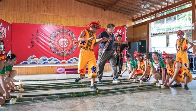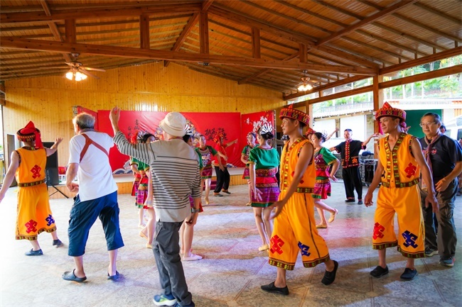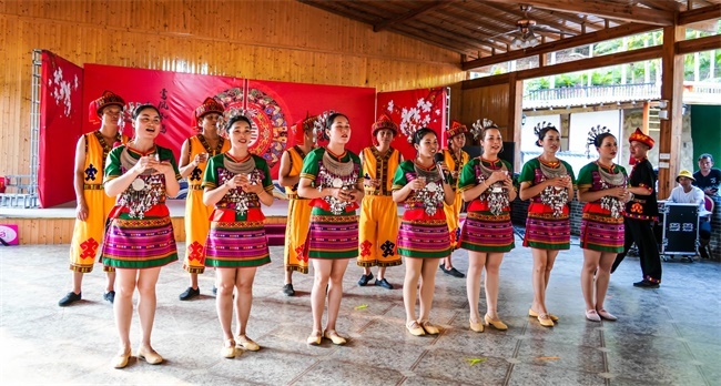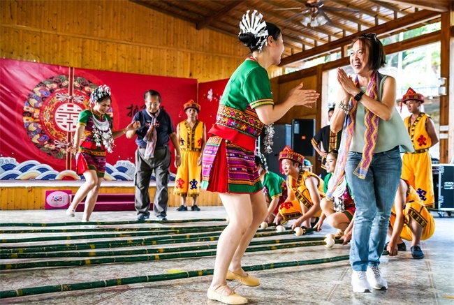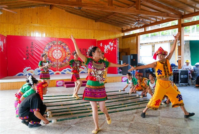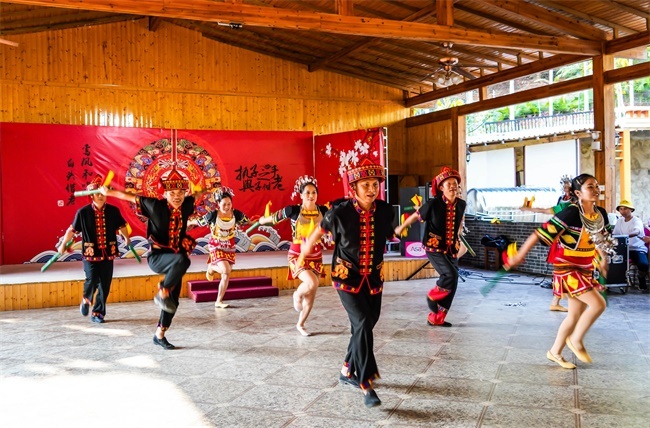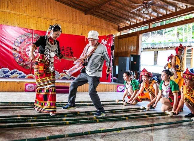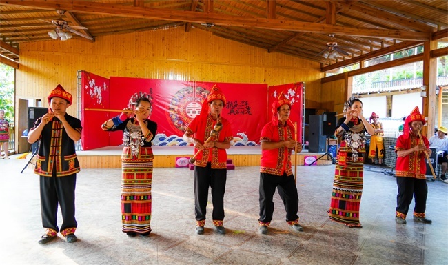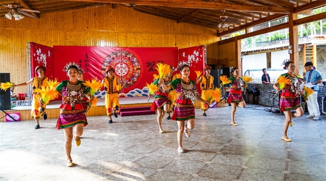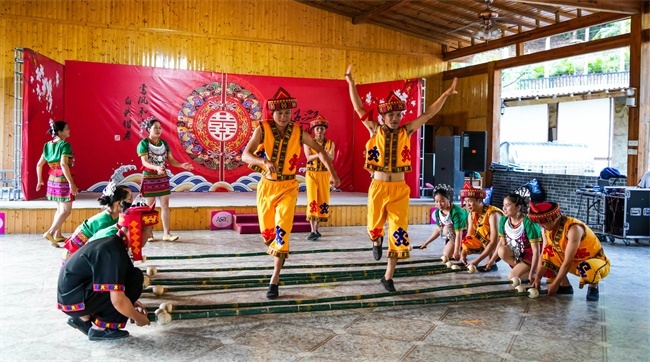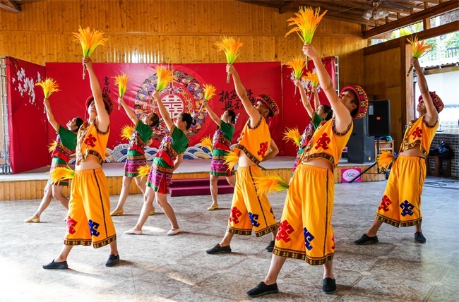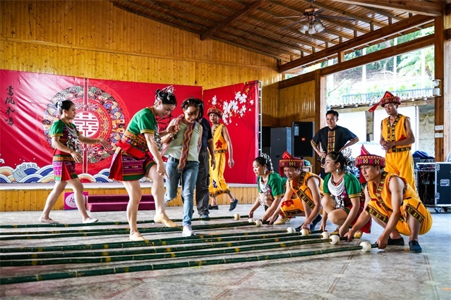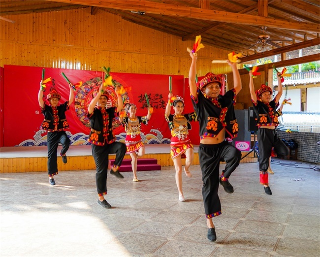 黎族阿哥阿姐们的《欢迎您到黎寨来》拉开了晚宴的序幕,热情洋溢的表演欢迎了远道而来的贵客。贵宾们品尝特色美食、共饮糯米酒,欣赏传统民族乐器带来的歌舞表演,并加入热情好客的黎苗表演团队,参与竹竿舞和共同舞等互动性极强的活动,一路欢歌载舞,尽情享受海南之旅的美好时光。